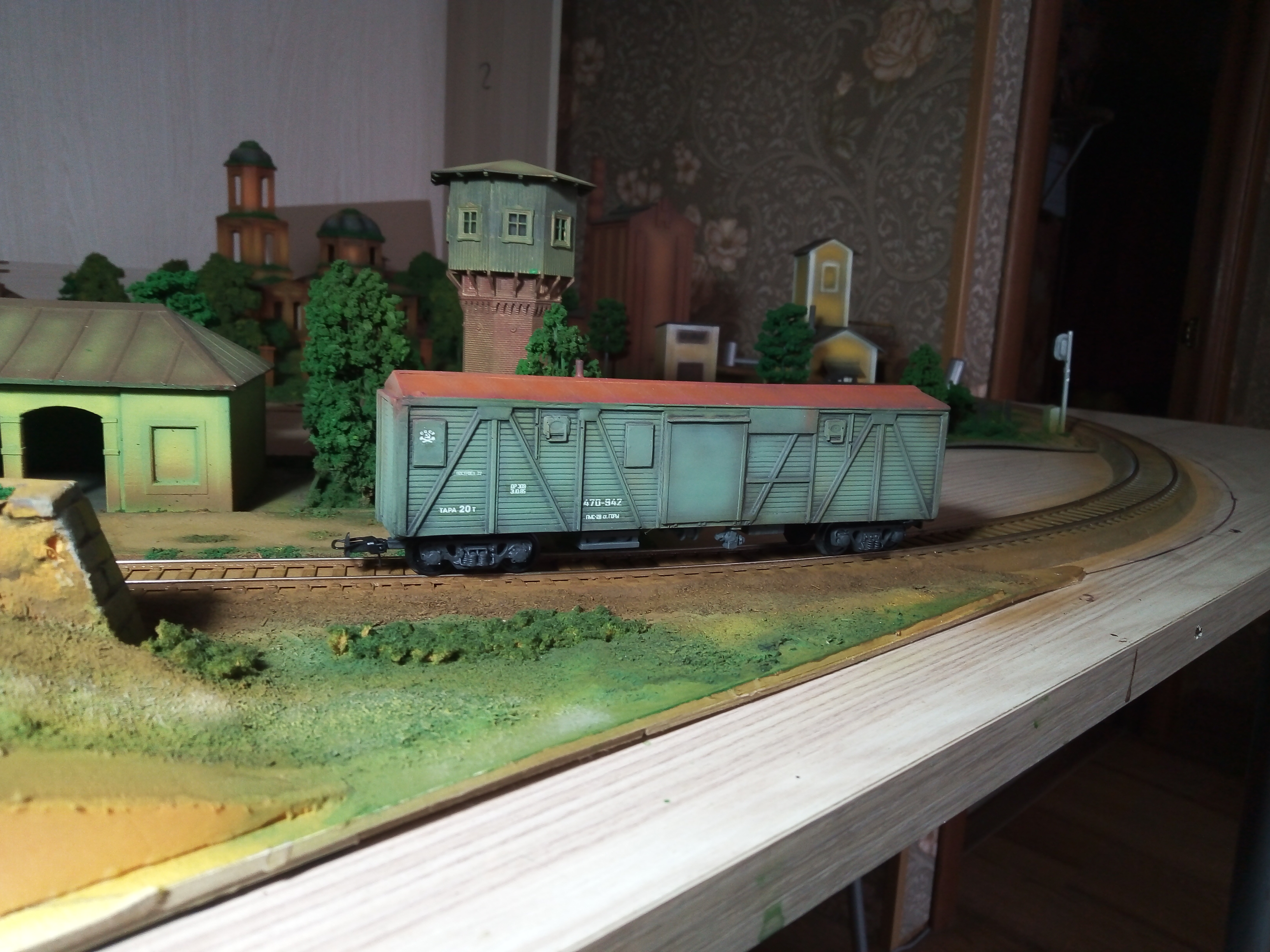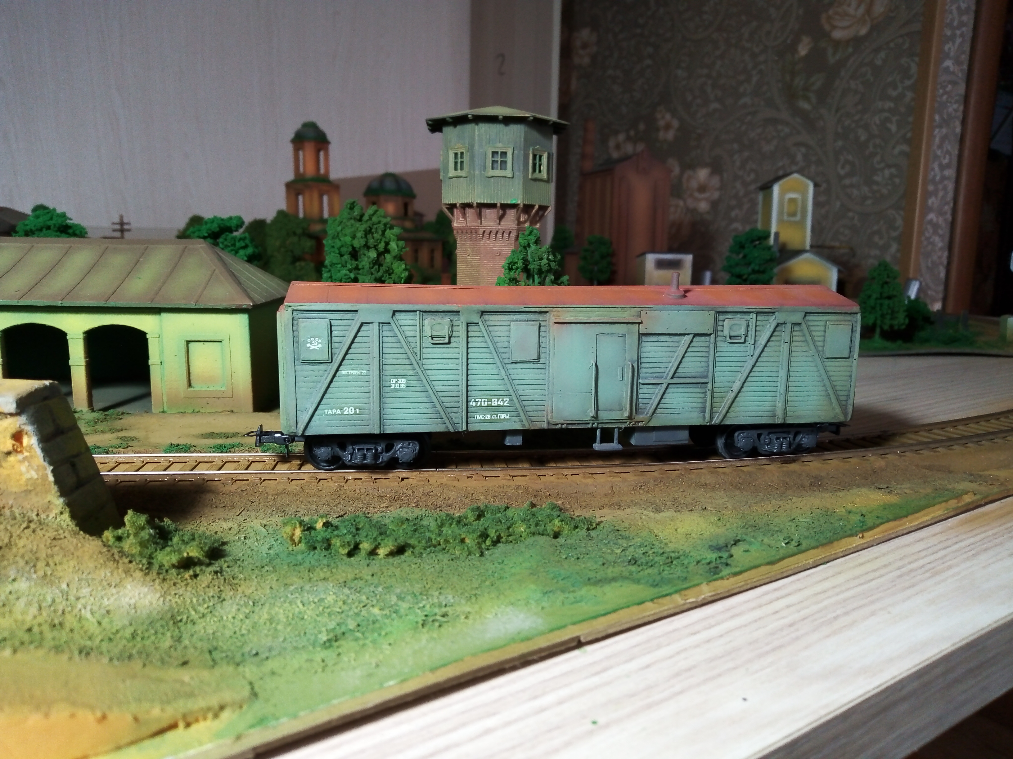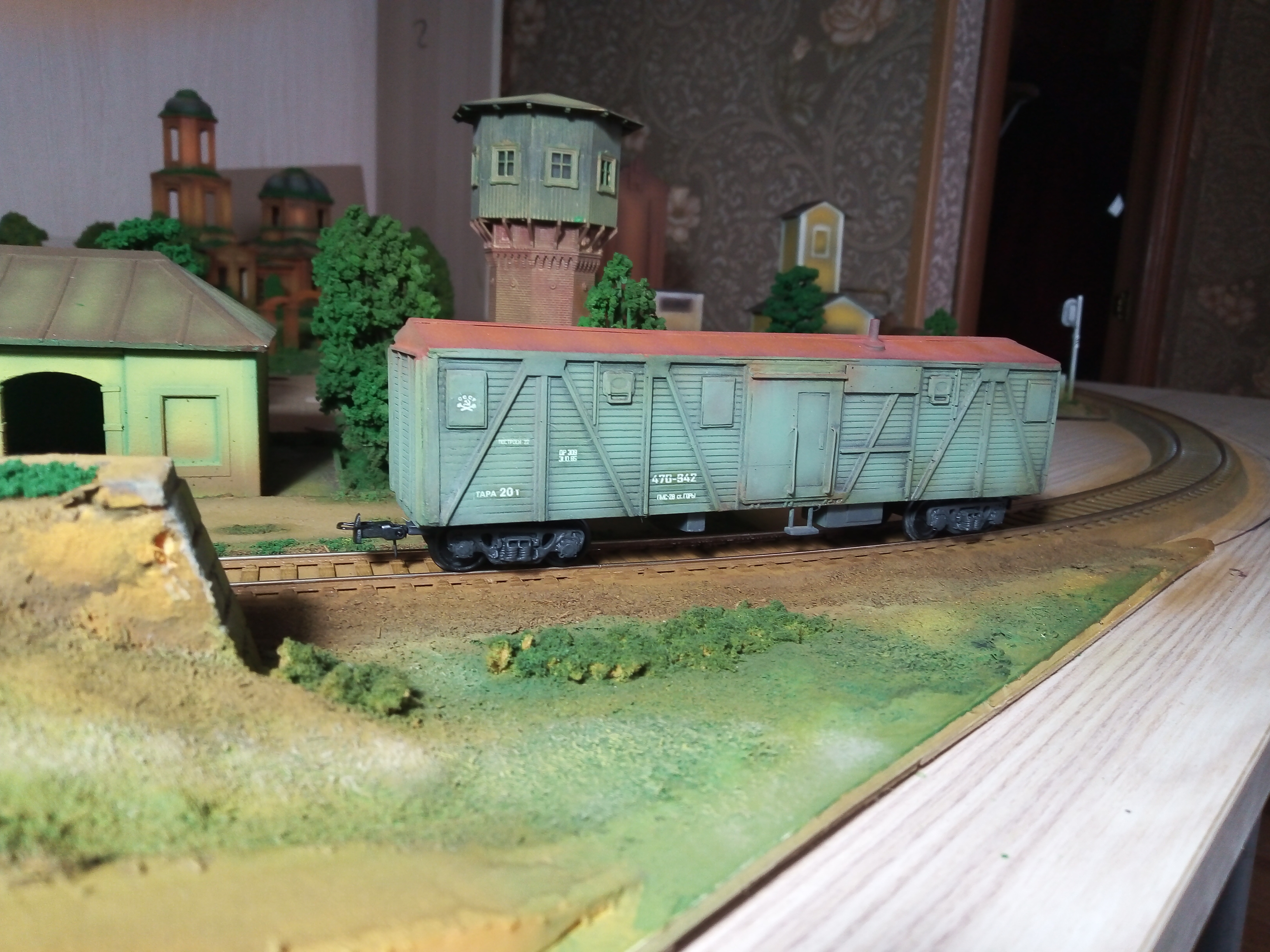 Турный вагон по мотивам. В основе смоляная отливка с доработками из полистирола. Тележки также смоляные с доработками. Установлены металлические поводки с шахтами, сцепки накидная петля. Колеса пластик EVEMODEL. Утяжелен, плавный ход. Окрашен художественным акрилом DECOLA.