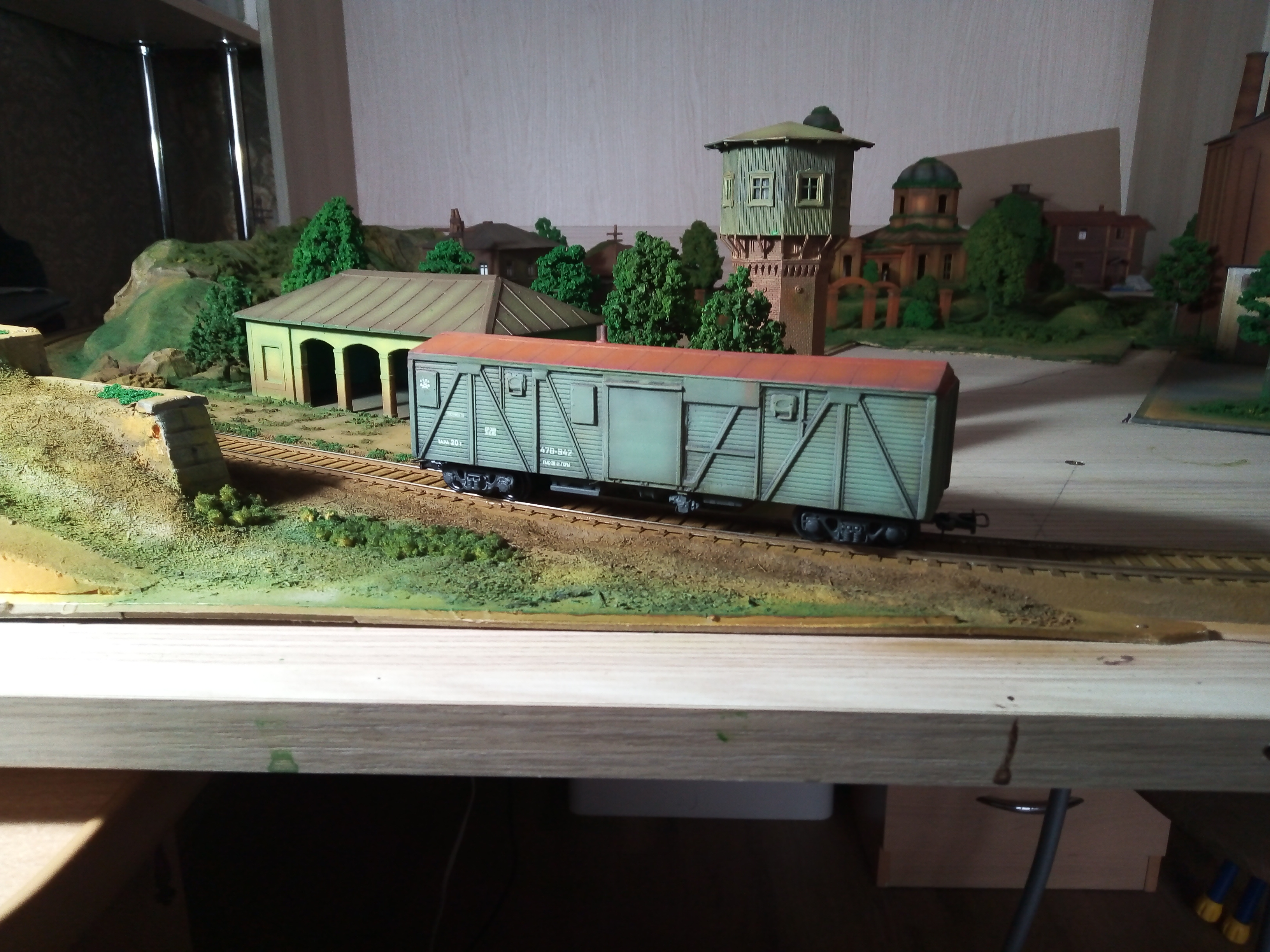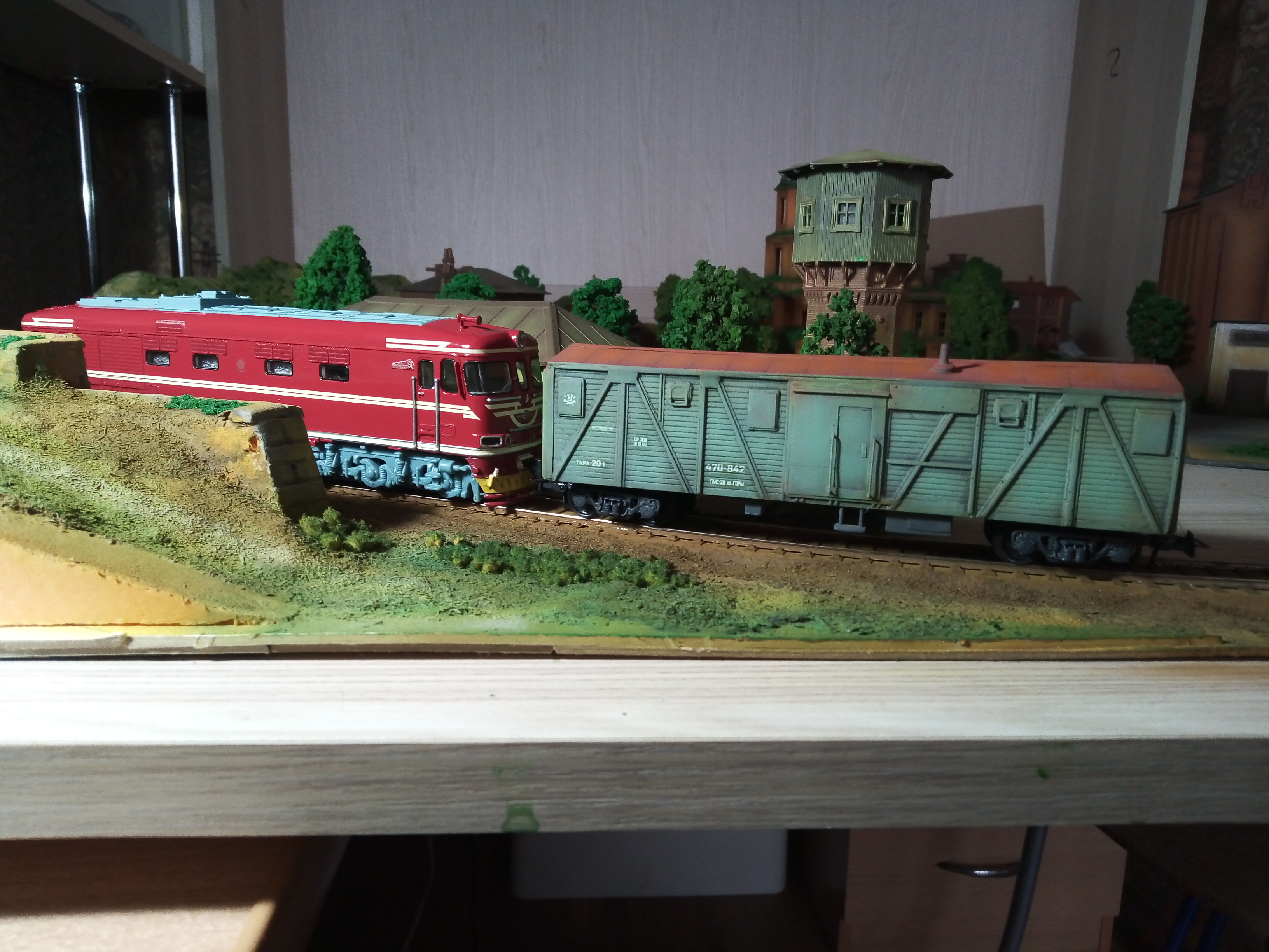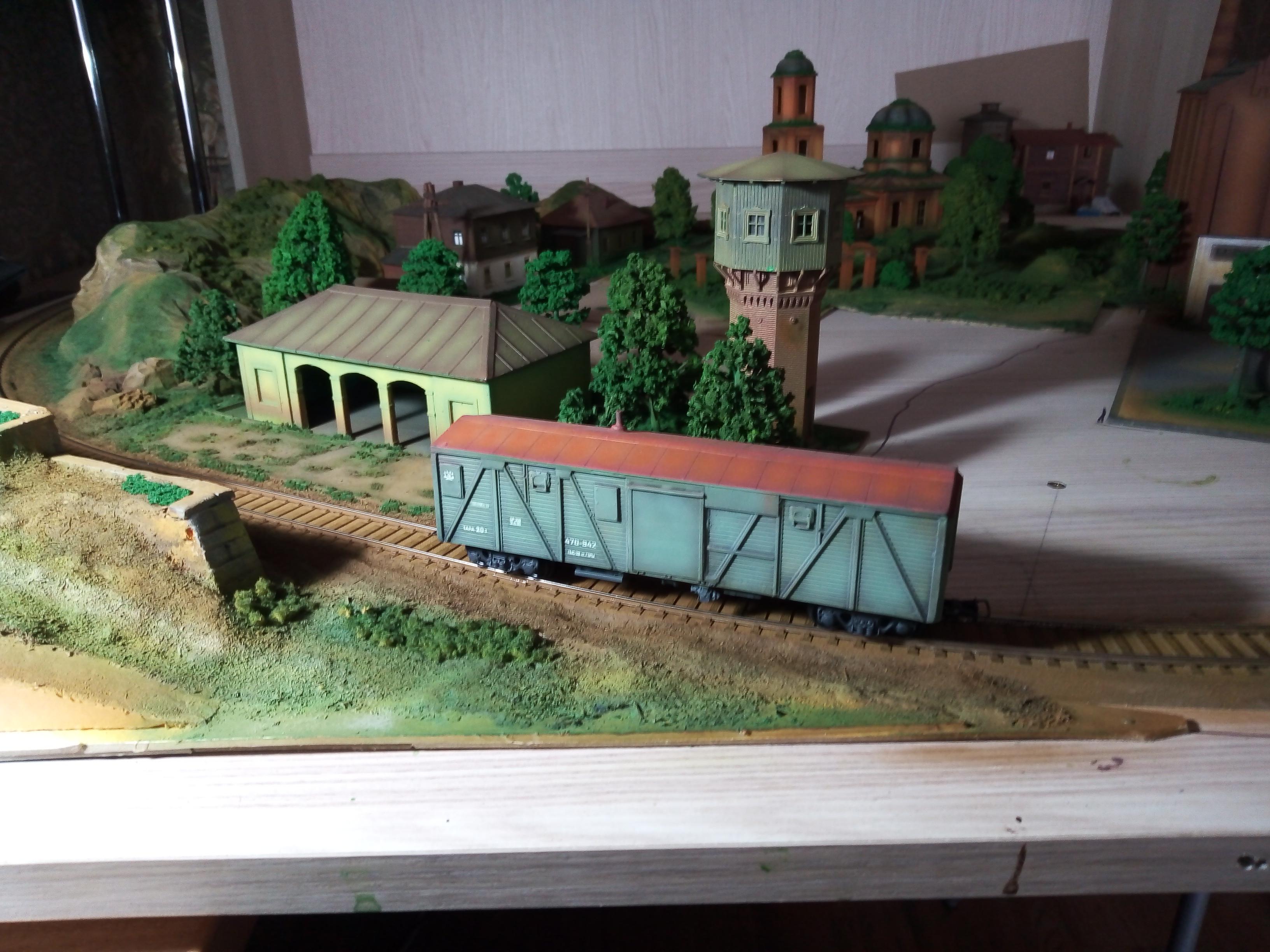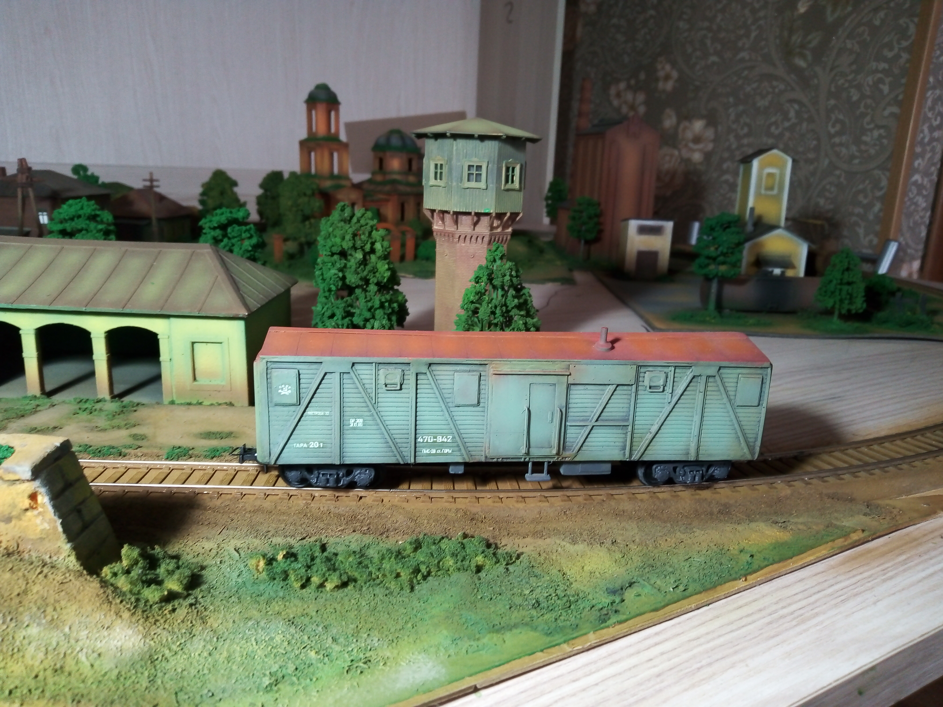 Турный вагон по мотивам. В основе смоляная отливка с доработками из полистирола. Тележки также смоляные с доработками. Установлены металлические поводки с шахтами, сцепки накидная петля. Колеса пластик EVEMODEL. Утяжелен, плавный ход. Окрашен художественным акрилом DECOLA.